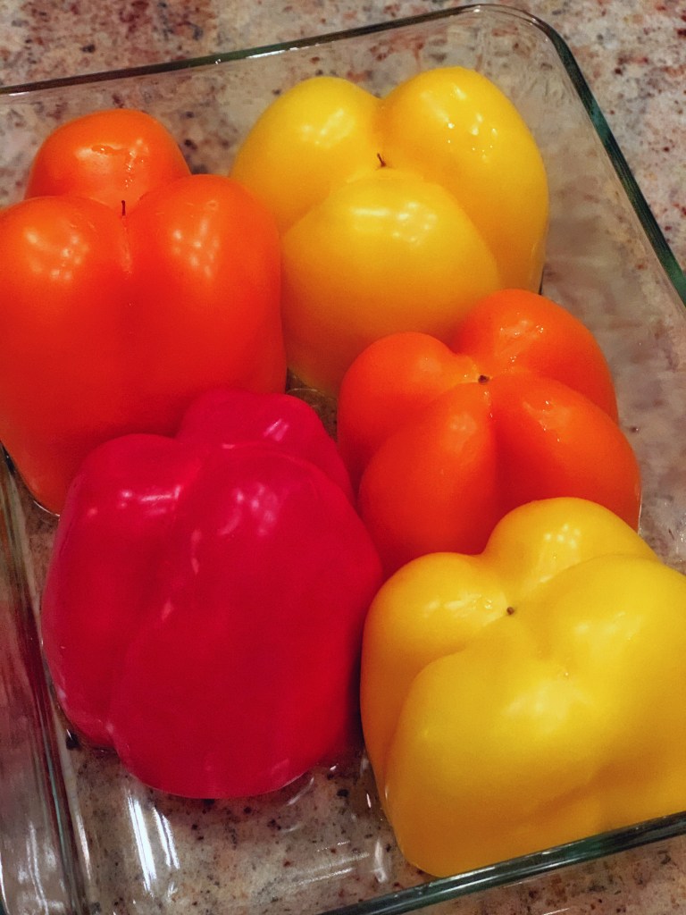 Preheat the oven to 400 degrees. Cut the tops off of the bell peppers and remove the seeds and ribbing. Fill a pyrex baking pan with 1/2 inch of water and place the bell peppers in, open-face down. Wrap with tinfoil and bake for 20 minutes. Once done baking, pull the peppers out of the oven & set aside. Reduce the heat to 350 degrees.