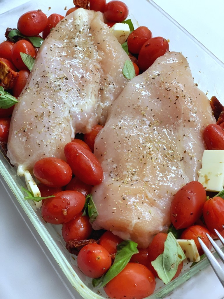 Preheat the oven to 400 degrees. In a pyrex pan, add the all the ingredients except the goat cheese and reserve some fresh basil leaves for garnish. Bake for 20-25 minutes uncovered, or until the chicken is fully cooked.