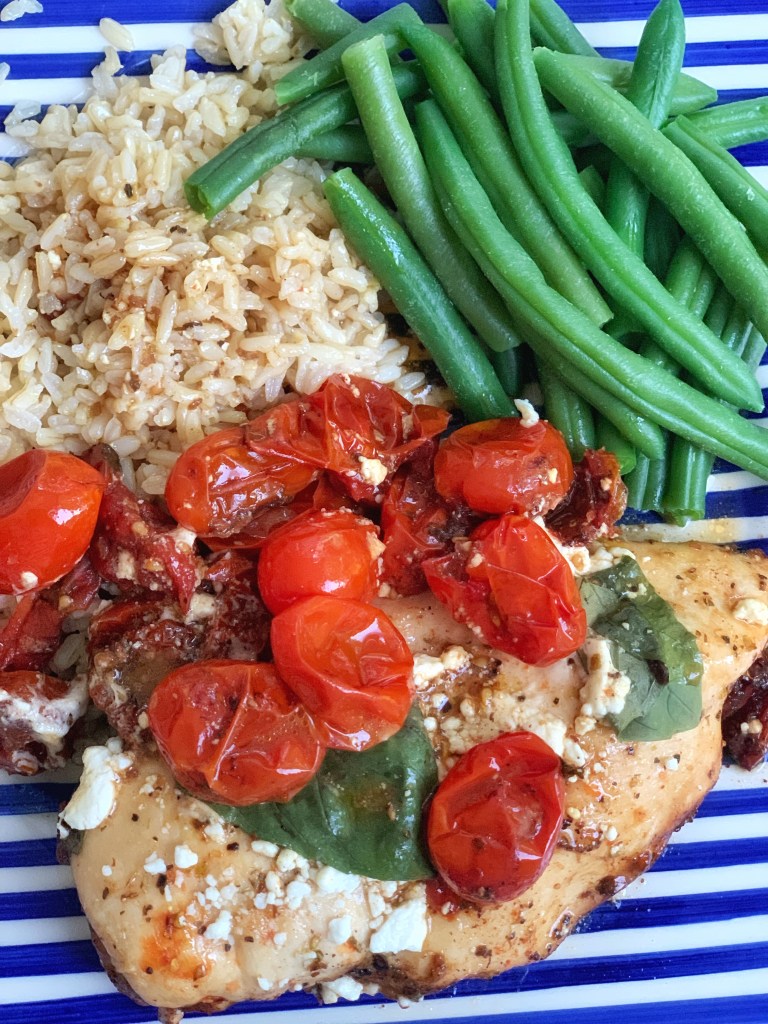 A simple, healthy & delicious meal does not get much easier than this roasted tomato chicken. I often prep it ahead of time while the baby is napping and then throw it in the oven while reading bedtime stories. The roasting of the tomatoes adds such a depth of flavor which is only enhanced with the aged balsamic vinegar. Goat cheese compliments the acidity of the tomatoes and vinegar but shaved parmesan cheese is also very good on this chicken dish.
