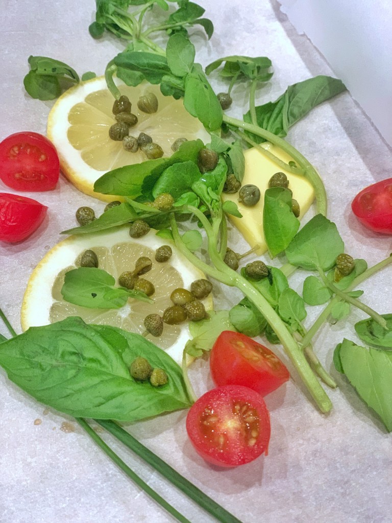 Preheat the oven to 400 degrees. Unfold the heart-shaped parchment paper. Using a kitchen brush, brush the edges of the parchment paper with the egg whites – this will help seal the paper edges. Near the inside fold of the parchment, layer the lemon slices, butter, herbs, greens, tomato slices and capers. Next, place the fish on top of the items and drizzle with olive oil and lemon juice. Season with M Salt or salt & pepper.