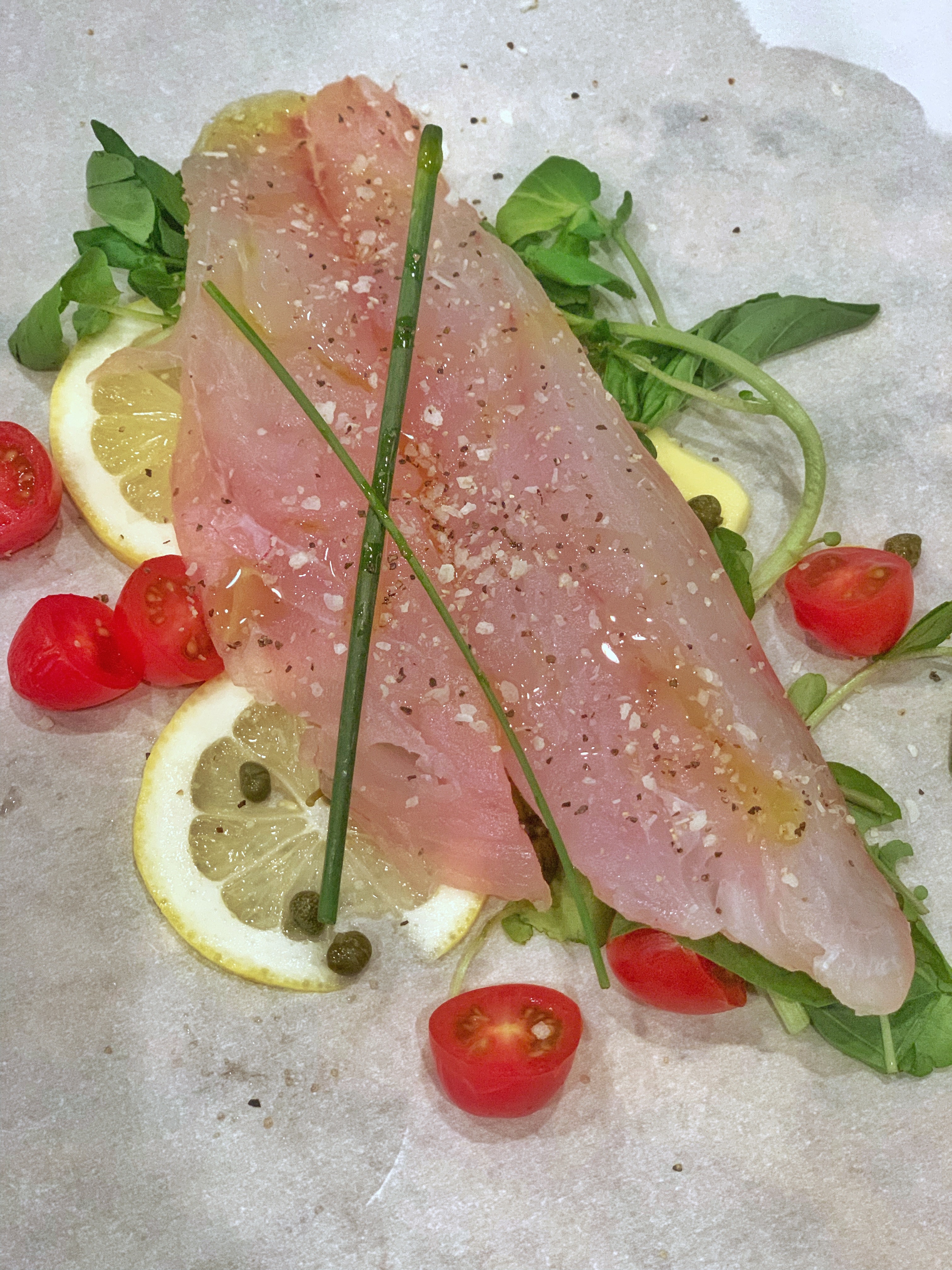 Before prepping the fish, prepare the parchment paper. You will want a parchment square for each guest. Each square should be about 4x the size of each fish fillet. Fold the square in half, and cut it into a large, fat heart-shape. Once prepped, set aside until the fish is ready to be prepped.