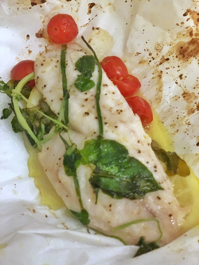 Bake for 14-17 minutes (depending on the thickness of your fillets), or until the fish is cooked through. It is ok if the parchment paper starts to brown.