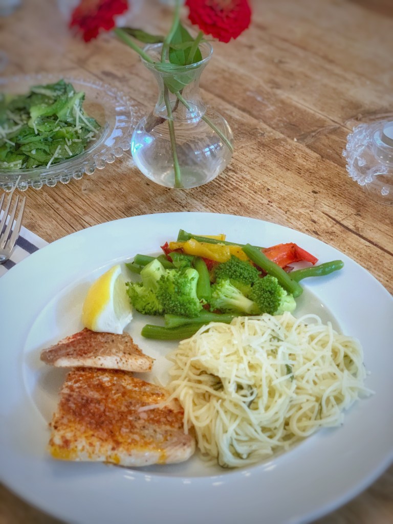 One of our family’s go-to pastas in the summer is this Lemon Dill Angel Hair pasta. So easy, so fresh. We don’t really measure, but add to taste. The menu is rounded out with fresh lake trout and steamed vegetables.