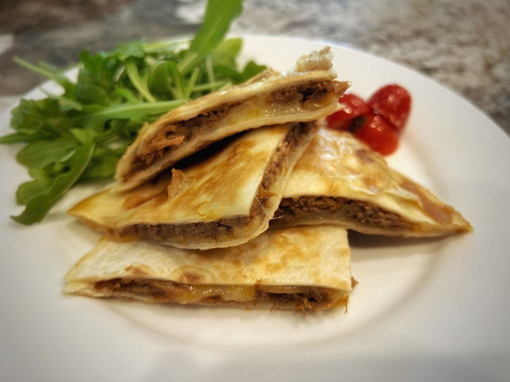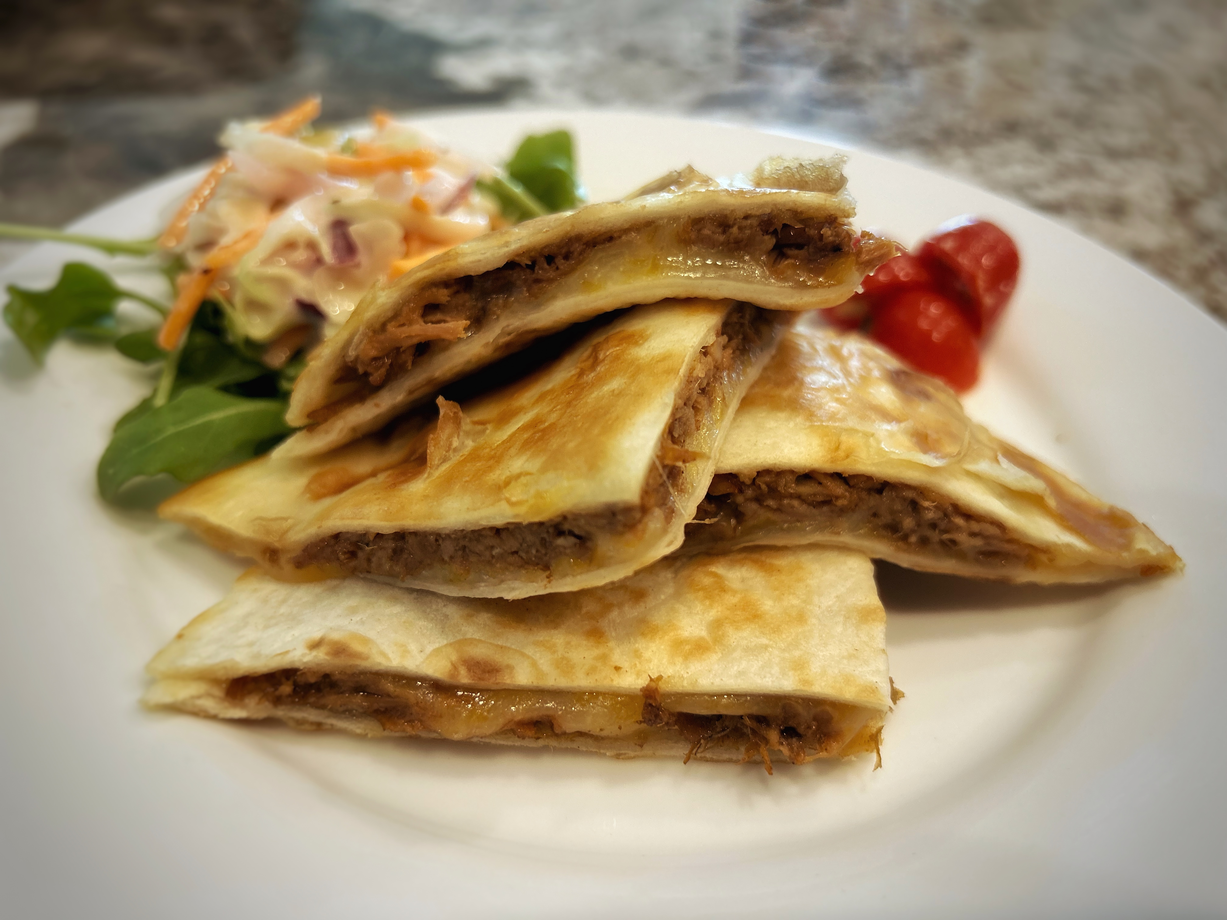 I have a thing for pulled pork sandwiches. I love them. There is just something so comforting and delicious about the combination of the sweet and tangy flavors. Good in all weather, it can evoke a summer day or snowy evening. After making the last batch of pulled pork, and several sandwiches later, I decided to make a twist on the classic with the remaining pork. Since cheese quesadillas are often on our two-year old’s weekly dinner request, I spun-off from the norm and added the pulled pork. Just as tasty and perhaps slightly less messy, the creation was a hit.