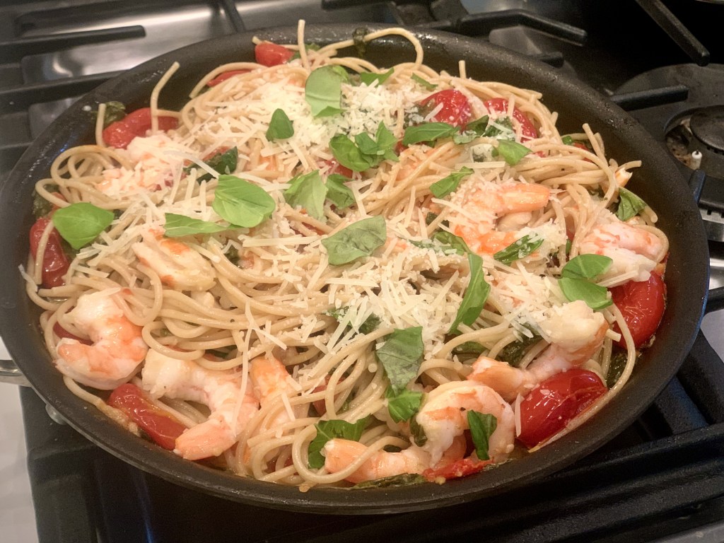 Using the tomato skillet, add the garlic and sauté for about 30 seconds, stirring often. Add the wine, red pepper flakes & lemon zest and bring to a simmer. Cook for an additional 4-5 minutes. Next, add the butter, salt, pepper, lemon juice and shrimp. Mix well and then transfer the pasta directly from the boiling water to the skillet. Toss the pasta with the sauce and top with fresh basil and shredded parmesan. Serve hot.