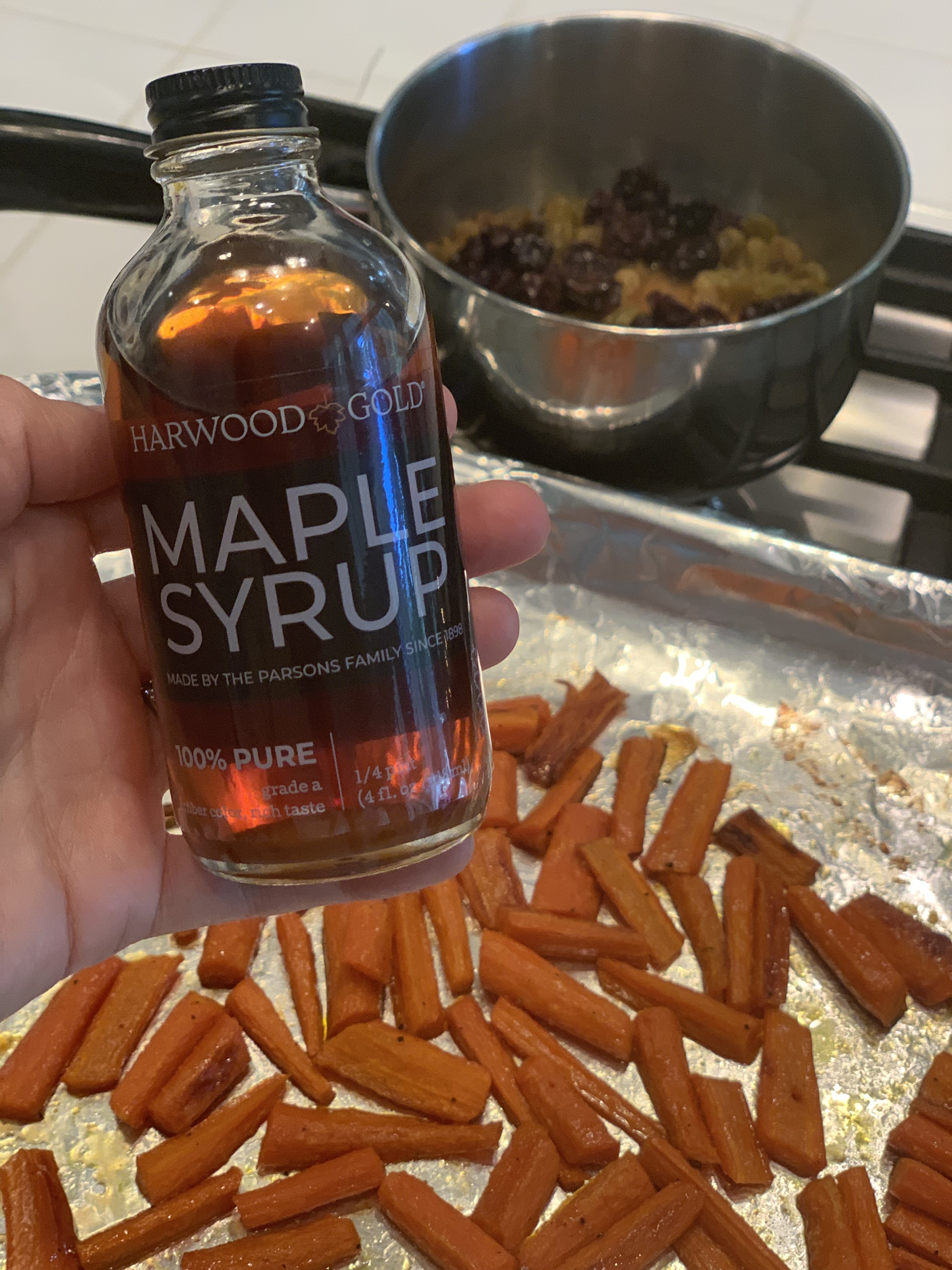 If you ever want to get a toddler to eat a vegetable, roast it in maple syrup. Adults will enjoy this sweet side dish as well. I love serving these alongside pork tenderloin or simply grilled chicken. Skip the baby carrots though and put in the extra effort to peel your own large carrots. The flavor is much better in the big carrots.
