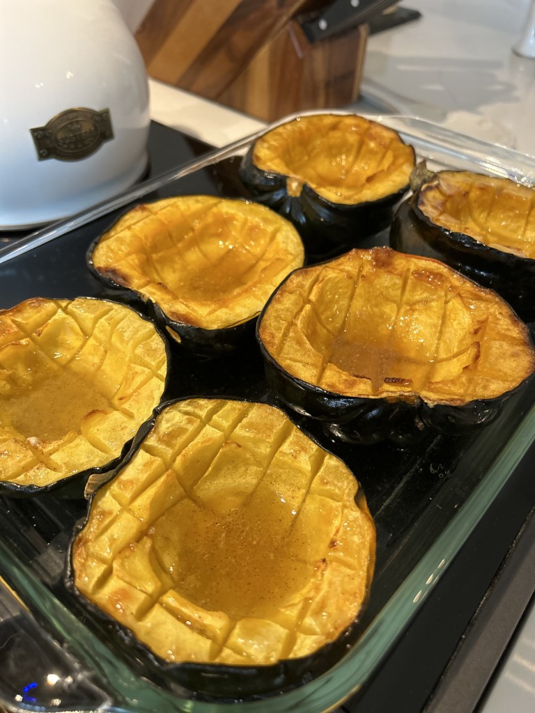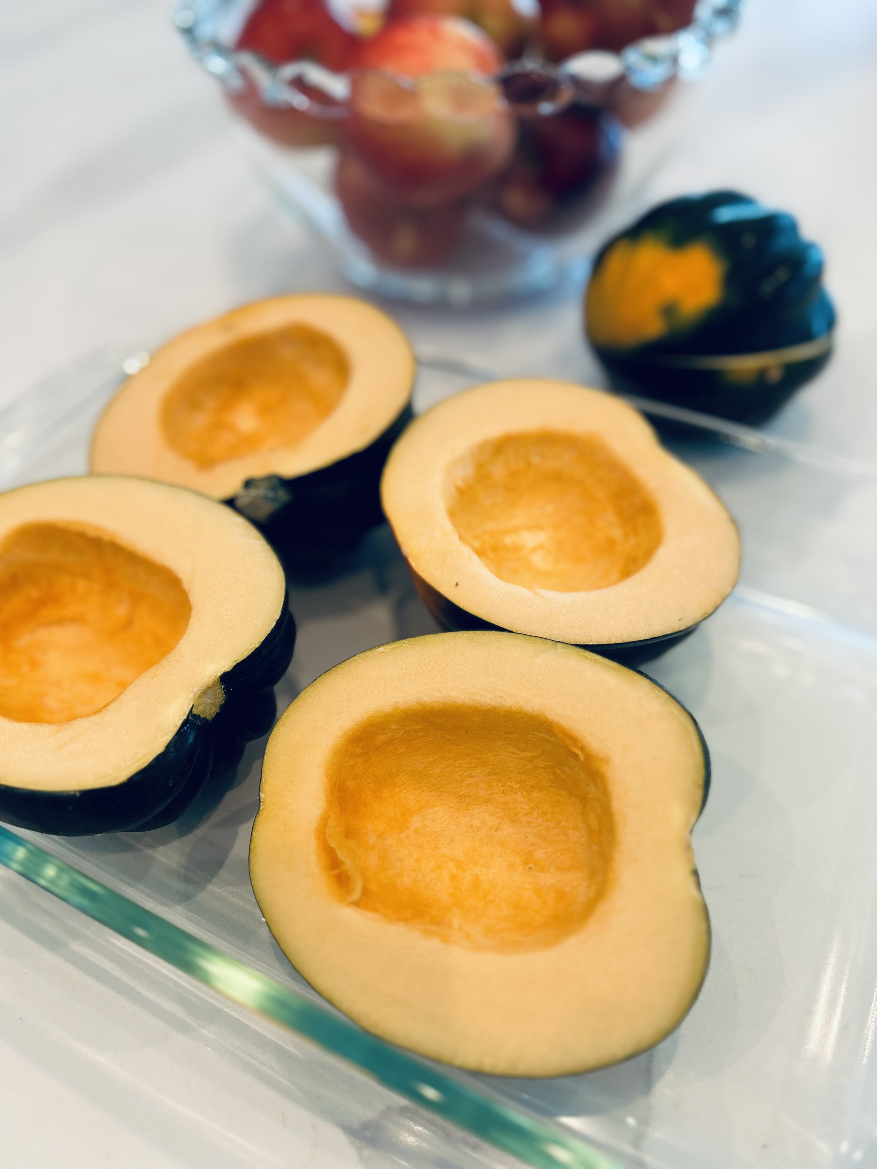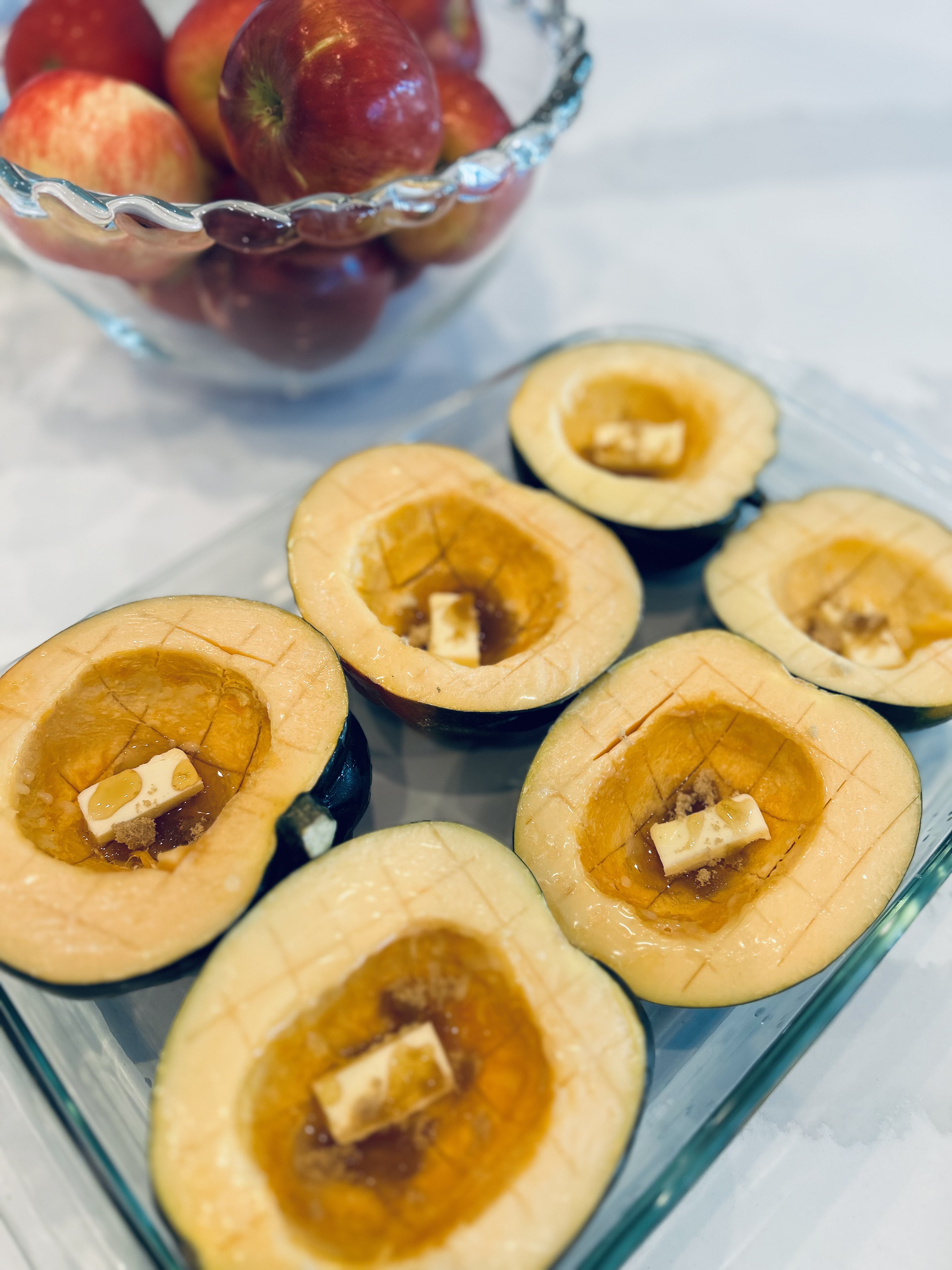 Autumn is one of my favorite seasons to cook, mainly because I love squash. Acorn squash has a sweet, nutty flavor, and it only becomes more enhanced when roasted with maple syrup. I place water in the pan as it acts similar to a steam oven and helps to keep the squash from drying out. Since cutting acorn squash is not an easy task, I often ask the produce department at our grocery store to cut and seed the squash.