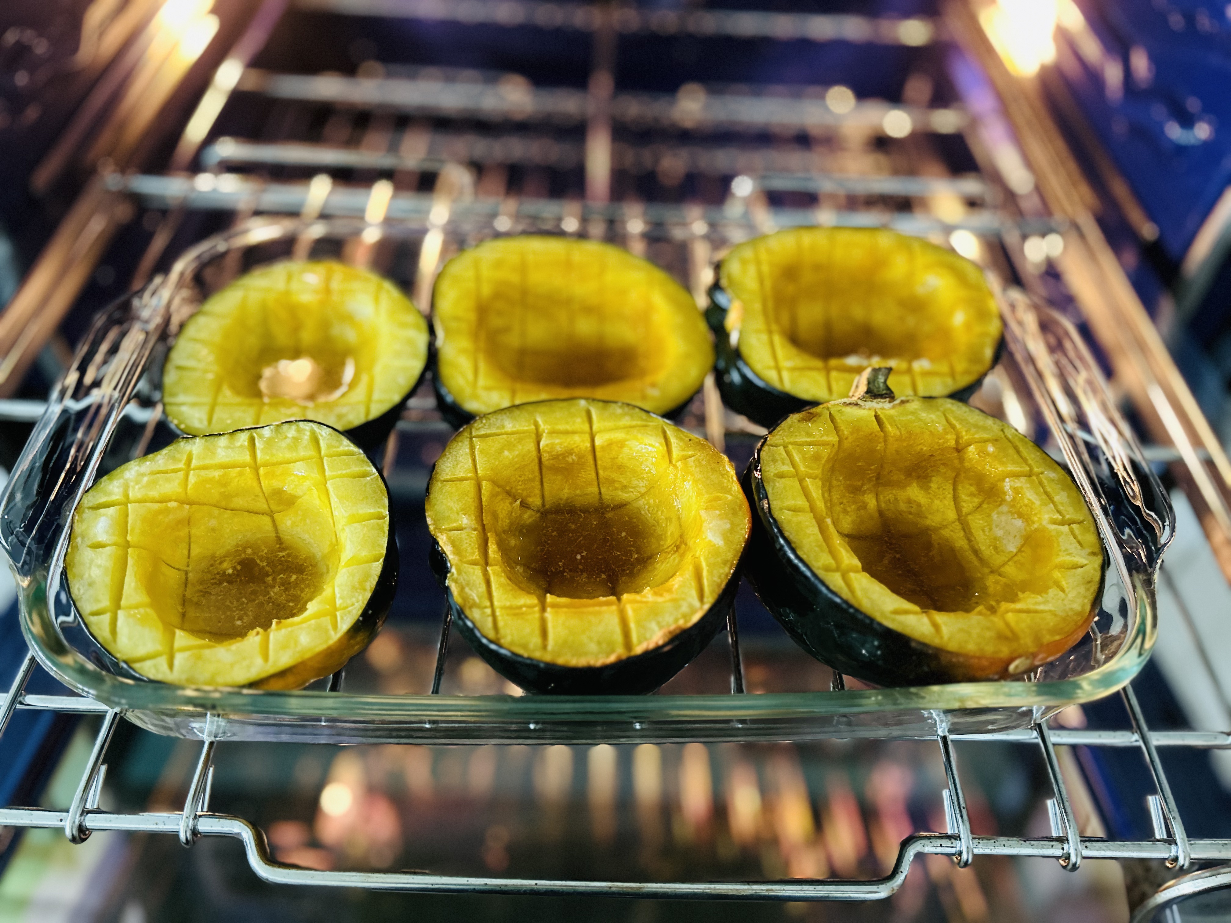 Fill a glass pyrex pan with an inch of water and place the squash in, cut-side up. Add a pad of butter into the center of each squash, roughly 1/2 a tbsp for each half. In a small bowl, melt an additional 2 tbs of butter and brush the melted butter on the top of the exposed flesh of the squash. Add a small amount of brown sugar & 1 tsp maple syrup to each squash, mix them into a paste and spread all around the inside cavity of the squash. Season with salt and a pinch of cinnamon.