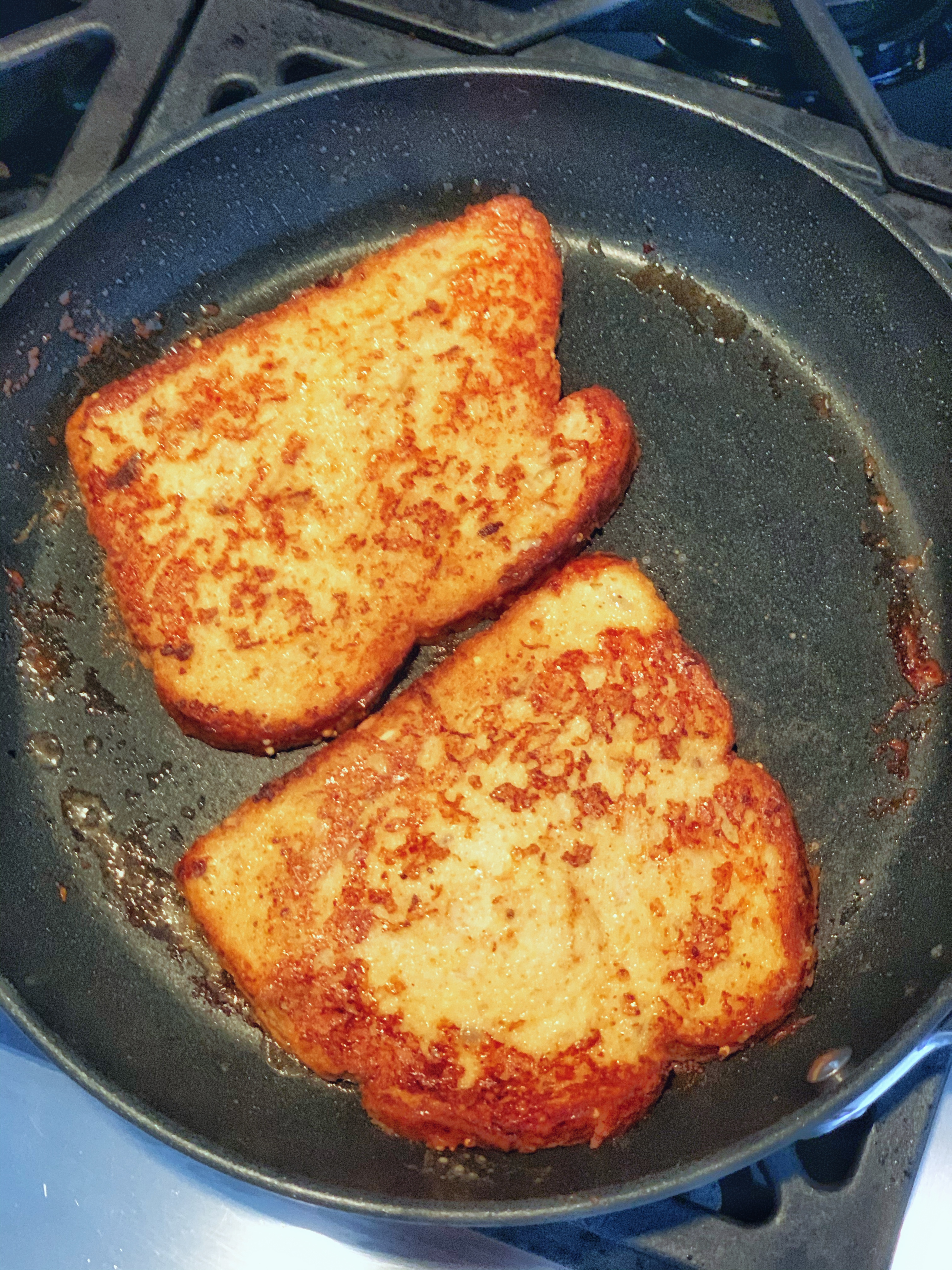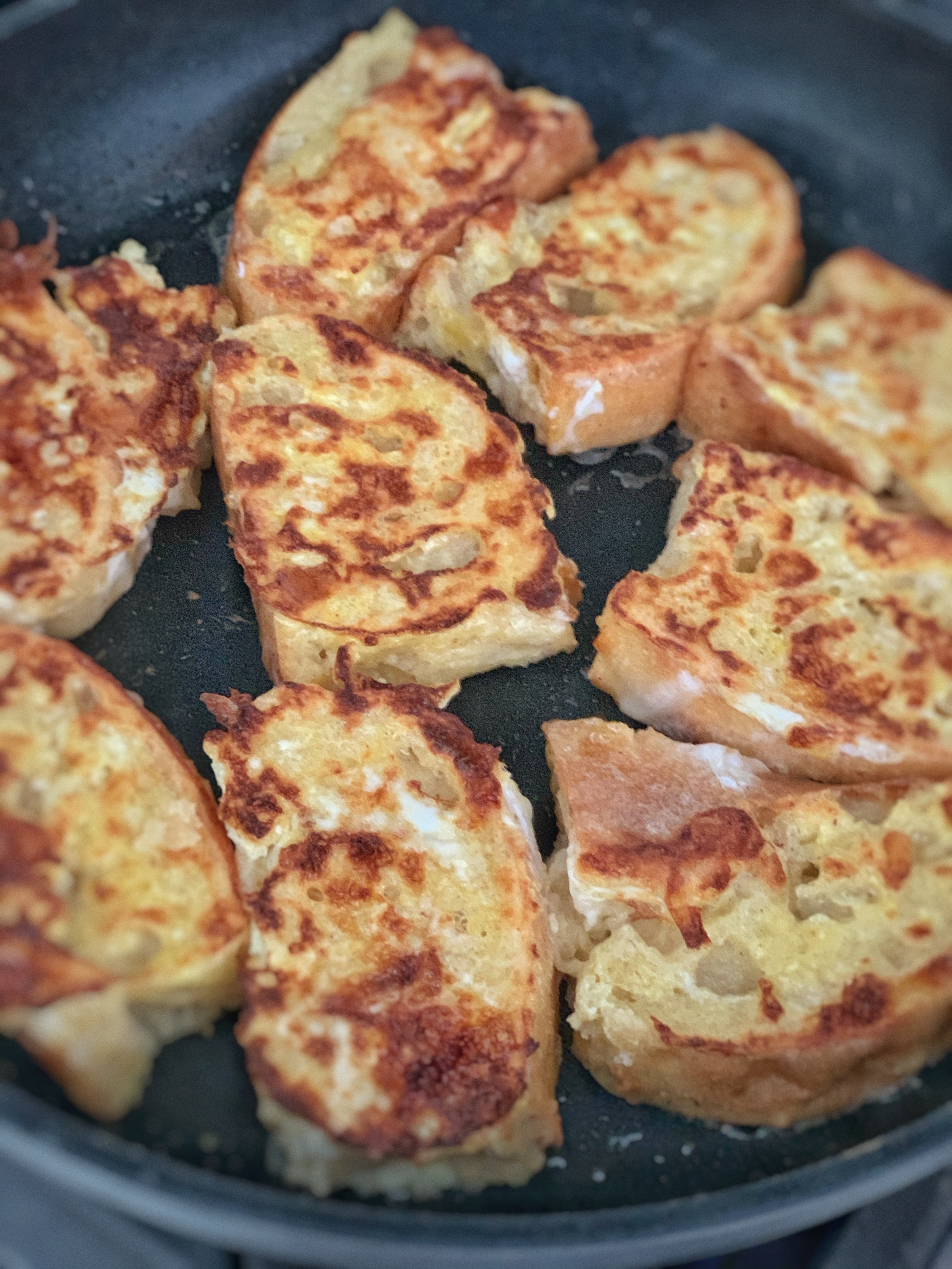 We have used leftover French bread, brioche… the key is just dense, and sometimes even slightly stale as it will hold up better on the skillet. The flour is not necessary but it helps make the custard more like a batter.