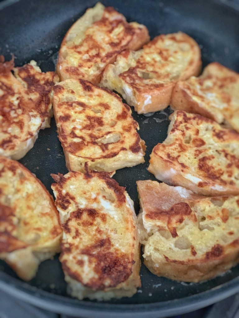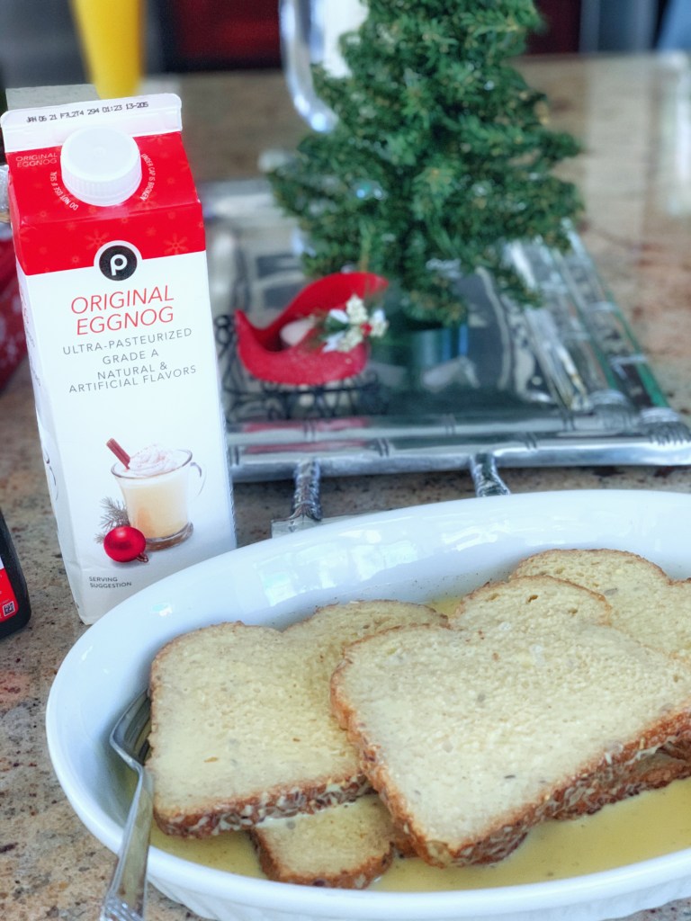 Every Christmas I get in the spirit, literally, and buy a big container of egg nog. I’m still not even sure I’ve even had egg nog, but yet, I still get it year after year. Come Christmas morning, I stare it and wonder what will come of it. Instead of dumping it down the drain, I have since started making delicious French Toast with it. Now this is a recipe to get you in the spirit!